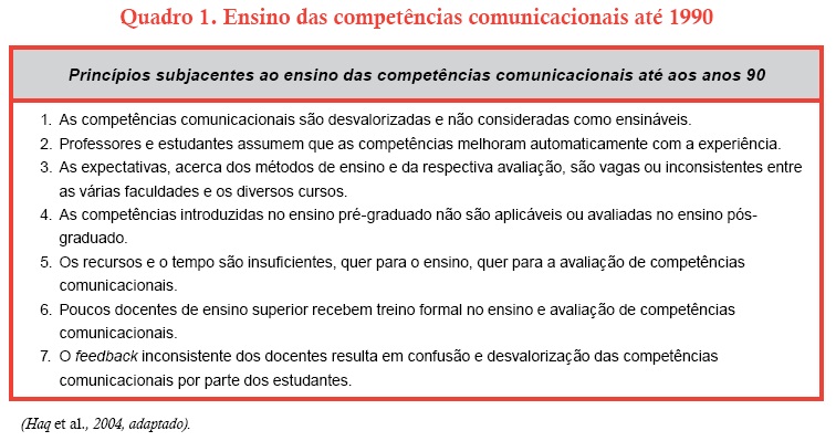 Em relação aos profissionais de saúde, o ensino de competências comunicacionais nas escolas médicas encerrava um duplo desafio. Por um lado, a tarefa per se, claramente distinta do ensino de competências técnicas; por outro, a necessidade de mudança de alguns dos princípios que sustentaram, durante décadas, a docência nas escolas de saúde (Haq, Steele, Marchand, Seibert e Brody, 2004) e que conduziram à prevalência, quase exclusiva, dos aspetos biomédicos (Rousseau e Blackburn, 2008) (quadro 1).