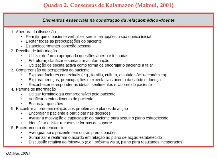 Em maio de 1999 os líderes e representantes de escolas médicas e organizações profissionais voltaram a reunir-se numa conferência em Kalamazoo, Michigan. O objetivo era agora identificar as tarefas essenciais na comunicação médico-paciente e também, os conhecimentos, atitudes e competências relevantes para cada tarefa. O grupo, liderado por Makoul, apresentou em 2001, um modelo sequencial, constituído por seis elementos considerados essenciais para a construção da relação médico-doente. Este modelo é hoje conhecido por consensus de Kalamazoo (Makoul, 2001) (quadro 2).