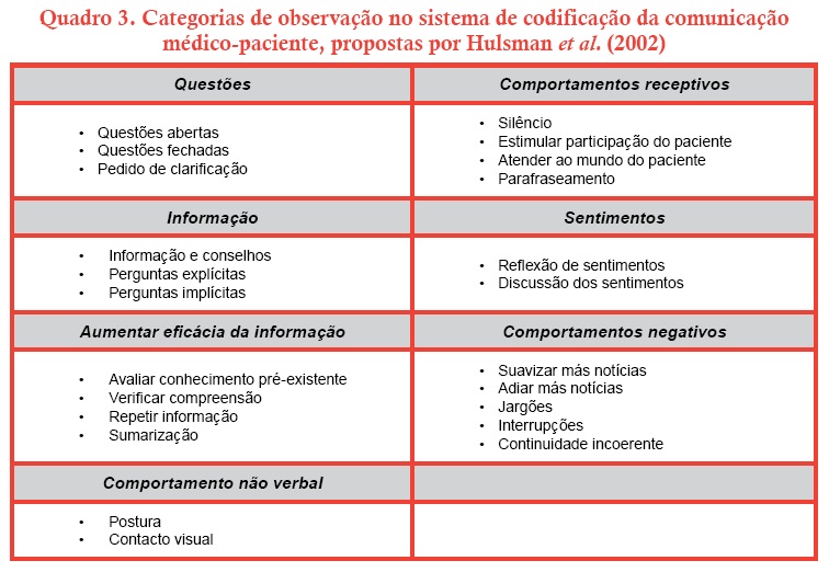 Dentro do conjunto reduzido de estudos que abordam um número maior de competências comunicacionais, o programa, desenvolvido por Hulsman et al., em 2002, merece especial destaque. Tratou-se de um programa, destinado a médicos especialistas em oncologia, em que os autores procuraram promover a utilização de um vasto leque de competências comunicacionais. O treino foi disponibilizado por computador,2 permitindo, desta forma, que os participantes controlassem o seu processo de aprendizagem e pudessem aceder, ao mesmo, em qualquer lugar. O programa envolveu quatro módulos: 1) comportamento verbal e não-verbal, 2) más notícias, 3) fornecimento de informação 4) lidar com as emoções dos pacientes. Na apresentação de cada um dos módulos, foram utilizados vídeos com exemplos de competências comunicacionais adequadas e inadequadas. As competências comunicacionais estudadas foram divididas em sete grandes grupos, sendo que, cada uma destas incluía várias categorias, num total de 23 (quadro 3). Para além da descrição de cada uma destas categorias, foram ainda incluídas sugestões para a sua utilização na prática.