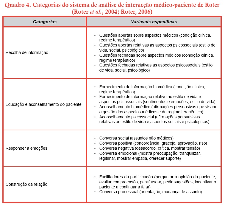 Também no programa realizado por Roter et al. (2004), para um grupo de 28 médicos que se encontravam no primeiro ano do internato em pediatria, as competências comunicacionais assumem particular relevo. O treino, com a duração total de quatro horas, distribuídas ao longo de quatro semanas, incluía os seguintes objetivos: ouvir mais e falar menos, recolha de informação, responder às emoções dos pais e construção de uma relação de parceria. Estes objetivos foram concretizados a partir de instruções diretas, feedback e realização de entrevistas com pacientes simulados, a partir de cenários estandardizados que retratavam a situação de uma criança que tinha sido hospitalizada com uma crise de asma, diabetes ou drepanocitose. Para a análise das verbalizações dos participantes, os autores recorreram à versão mais atualizada do RIAS.3 Este método de codificação das interações médico-paciente parte de quatro categorias principais: recolha de informação, educação e aconselhamento do paciente, resposta às emoções e construção da relação (Roter e Hall, 2006). Cada categoria inclui variáveis específicas (quadro 4), definidas por Roter (2006), de forma a permitir a codificação das interações em vídeo, sem ser necessário recorrer à sua transcrição.