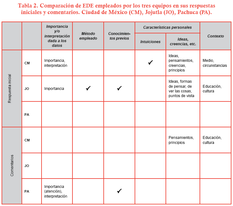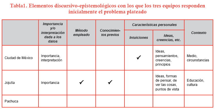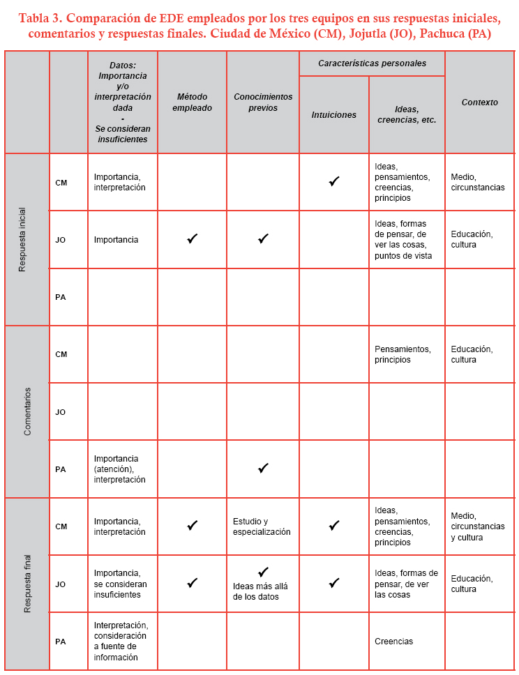 Aunque en este sentido, cabe la observación de que las RSC y los elementos que las constituyen, así como las habilidades para resolver problemas, desarrollar explicaciones, llegar a conclusiones y tomar decisiones, son más parecidas entre los equipos CM y JO. El equipo PA, por su parte, muestra un menor dominio de estas habilidades y de los EDE relacionados con la ciencia y el trabajo científico. En este sentido, es probable que nos encontremos frente a diferentes culturales escolares (Rockwell, 1999, 2000); unas más "problematizadoras" que propicien la resolución de problemas, el trabajo colaborativo, el desarrollo de explicaciones, la toma de decisiones y la formulación de conclusiones, y otras que no. De ahí que el equipo PA, por ejemplo, no haya comprendido el problema, no lo haya identificado y no haya ideado la manera de resolverlo.