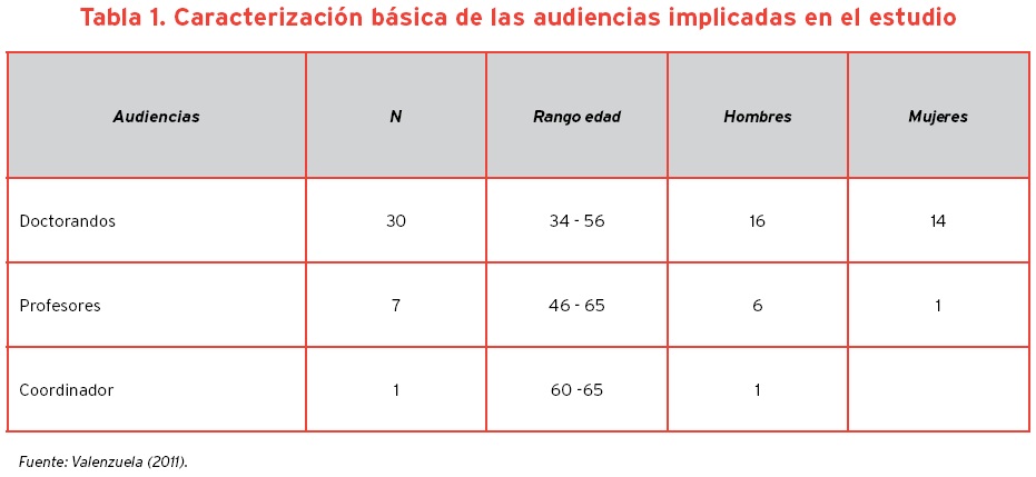 En el trabajo de campo se recogió información del 60% de los estudiantes, el 100% de los profesores/directores de tesis y del coordinador. Una caracterización básica de las audiencias implicadas se muestra en la tabla 1.