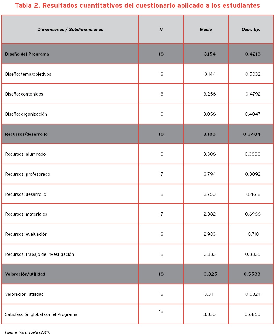 Los resultados de los cuestionarios aplicados a las audiencias demuestran que el nivel de satisfacción es alto en las tres dimensiones evaluadas: diseño, recursos y valoración; lo mismo en la valoración global del Programa. Una síntesis de estos análisis revela que los aspectos más satisfactorios para los estudiantes fueron los recogidos en las subdimensiones de "recursos-profesorado" y "recursos-desarrollo". En la tabla 2 es posible constatar que las subdimensiones con menor nivel de satisfacción pertenecen a "recursos-materiales" (instalaciones y medios disponibles) y "recursos-evaluación".