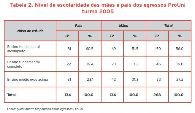 A pouca escolaridade dos pais acima apresentada, intensifica a satisfação dos mesmos em terem filhos graduados: 'Os meus pais ficaram felizes com a minha formatura. Sou a 1ª pessoa na minha família a se formar!' Segundo estudos de Pascarella e Terenzini (2005), a experiência dentro da faculdade pode ser mais importante para os estudantes de primeira geração familiar neste nível de ensino do que para os alunos cujos pais já têm tal formação.