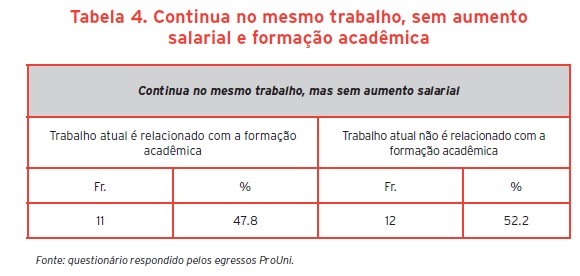 Na tabela 4 observa-se que 47.8% dos 23 respondentes que continuavam no mesmo trabalho quando agraduação e que não tiveram aumento salarial, tinham seu trabalho relacionado com a formação acadêmica. Já aqueles em que o trabalho não era relacionado com a formação acadêmica corresponderam a 52.2% dos 23. Esses percentuais correspondem respectivamente a 8.9% e 9.8% dos 123 respondentes que estavam trabalhando.