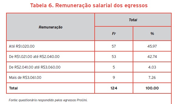 As questões remuneração e trabalho aparecem na fala dos respondentes associadas à formação conquistada via o programa: 'Agradeço a existência do ProUni, porque foi a maior oportunidade que tive em minha vida. Hoje estou atuando na área, tenho a minha carteira assinada a qual estava em branco havia muitos anos. Realmente este é o meu maior presente'.