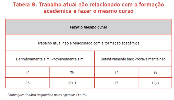 Os respondentes evidenciam a relevância da uma formação acadêmica em suas vidas uma vez que esta corrobora para com a formação de um conjunto mais amplo de qualidades pessoais que tornam as pessoas melhor preparadas para o mercado de trabalho, logo terem melhores empregos e serem bem sucedidas profissionalmente. 'Minhas experiências foram ótimas, sou outra pessoa agora, mais esperta, informada, destemida, comunicativa. Outro egresso diz que profissionalmente, meu trabalho melhorou bastante depois do curso'.