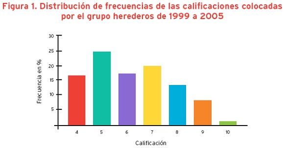 En la figura 1 se observa la distribución de las frecuencias relativas de las calificaciones colocadas por el grupo herederos de 1999 a 2005 y en la figura 2 la distribución de frecuencias de las calificaciones colocadas por el grupo innovadores en el mismo periodo.