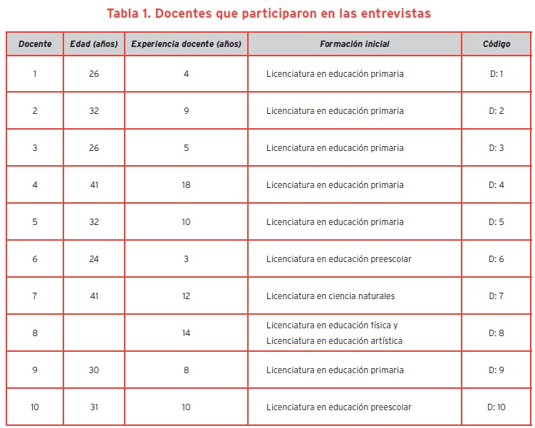 La entrevista semiestructurada se aplicó a diez docentes-alumnos de la UPN 291 del estado de Tlaxcala, de los cuales ocho fueron de la maestría en Educación y dos de la licenciatura en Educación. El guión utilizado tuvo seis núcleos temáticos: el primero acerca de la RIEB; el segundo sobre los cursos de actualización para implementar la RIEB; el tercero acerca de los obstáculos para implementar la RIEB; el cuarto incluye los cambios de la práctica docente ante la RIEB; el quinto la calidad educativa del Sistema Educativo Mexicano (SEM) y su relación con la RIEB, y, finalmente, el sexto abarca el futuro de la RIEB.