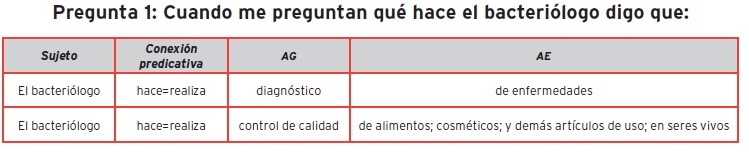 Como se puede notar, establece dos tipos de acción del bacteriólogo: diagnóstico y control de calidad. En el primero, especifica que es de enfermedades. En el segundo, que se hace sobre alimentos y otros objetos que usan o se usan en seres vivos. Esta respuesta tiene la siguiente estructura discursiva (es un caso, por cierto, de oración compuesta), la cual ha sido construida como predicado a partir del sujeto y la conexión predicativa planteados en la pregunta (con propósitos de claridad, los diversos AE de un AG, se separan por punto y coma):