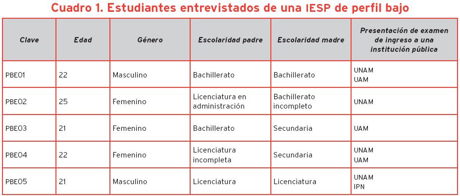 En la cita anterior se identifica la importancia que tiene para los estudiantes proseguir con sus estudios superiores, aprovechar el tiempo y no esperar más. Se logró distinguir que para este entrevistado tuvo mayor peso darle continuidad a sus estudios que acceder a la educación superior pública. Así, se puede señalar, o bien constatar, lo que algunos autores han señalado (Silas, 2005; Mendoza, 2004): las IESP de bajo perfil generalmente surgen para atender la demanda de educación superior, ya que el sector público no puede ofrecer una mayor oferta educativa.