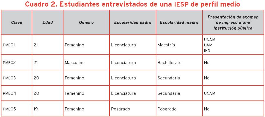 Se realizaron cinco entrevistas a estudiantes de una IESP de perfil medio. Las principales instalaciones de la institución se encuentran en el centro de la ciudad de México, además de contar con ocho campus en el país y también tienen un campus virtual en donde se puede tener la formación profesional a través de una plataforma de internet. La IESP ofrece ocho licenciaturas, una especialidad y una maestría, todas en el área de administración y contabilidad; es decir, se ha especializado y consolidado en un área formación específica. Cuenta con una antigüedad importante de más de 50 años. Se considera que es una institución de perfil medio, puesto que tiene reconocimiento de un organismo acreditador de calidad que es FIMPES, con el nivel más alto llamado Liso y llano, además tiene registro de Institución de Excelencia Académica, otorgado por la SEP.