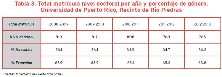Por otra parte, la Oficina de Planificación Estratégica y Presupuesto de la Universidad de Puerto Rico, Recinto de Río Piedras (2014), refleja en el informe anual de los pasados cinco años una proporción mayor de mujeres en el nivel doctoral tanto en la matrícula como en grados conferidos, comparable con otras universidades en Estados Unidos, Latinoamérica y Europa. En la tabla 3 se muestra el porcentaje de mujeres y hombres matriculados en los programas a nivel doctoral en la Universidad de Puerto Rico. Se observa una tendencia firme entre los ciclos académicos 2008-2009 y 2012-2013. Es decir, la proporción de estudiantes matriculados en el nivel doctoral se sustenta mayormente por la participación aproximada de un 64% de mujeres en comparación con 36% de hombres.