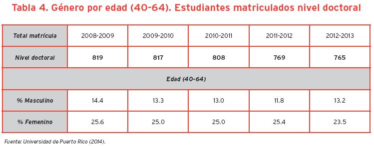 De otro lado, en la tabla 4 se presenta los datos de la matrícula del nivel doctoral por grupo de edad (entre 40 y 64 años) y género, en la que se reafirma que en la Universidad de Puerto Rico del total de estudiantes matriculados en programas a nivel doctoral, las mujeres adultas representan el 25.0% aproximado en contraste con los hombres que sólo representan el 13 por ciento.