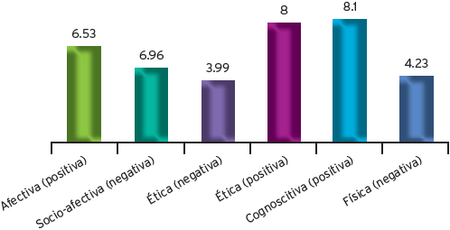 De las seis dimensiones de autoestima, gratamente la que muestra la media más baja es la dimensión ética negativa (soberbia) y las que evidencian las más altas son también la ética pero positiva y la escala cognoscitiva. La otra dimensión de signo positivo manifiesta un valor medio módico.