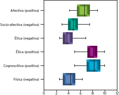 En consideración de las dimensiones de la autoestima, se advierte que la ética positiva (+) y cognoscitiva, evidencia los grados más elevados de autoestima, mientras que la afectiva presenta puntuaciones más bajas que estas dos. La dimensión ética negativa (-), socio-afectiva (-) y física (-), manifiestan valores más bajos de autoestima. Esto quiere decir que, de las seis dimensiones, la que presenta puntajes más bajos es la ética negativa, señalando que son casos extraordinarios los que tienen conductas soberbias, en tanto, las dimensiones positivas indican que los estudiantes demuestran cierta seguridad acerca de lo que se considera bueno y de las conductas correctas que se deben realizar para las personas y para la sociedad, y aceptan responsabilidades, errores y aciertos; tienen confianza en sus capacidades y se muestran receptivos a adquirir nuevos conocimientos, nuevas experiencias y, por último, son capaces de expresar los sentimientos, sensaciones, temores y de establecer vínculos afectivos reconocidos como valiosos entre compañeros, amigos y familiares, aunque con menos frecuencia. En cuanto a la valoración del aspecto físico, la autoestima tiende a ser relativamente baja. Caso contrario a lo hallado en otra investigación realizada con personas con discapacidad física específicamente, en donde se obtiene que éstas presentan una valoración positiva de su imagen corporal, especialmente en la esfera de la satisfacción con el cuerpo (Botero-Soto et al., 2013).