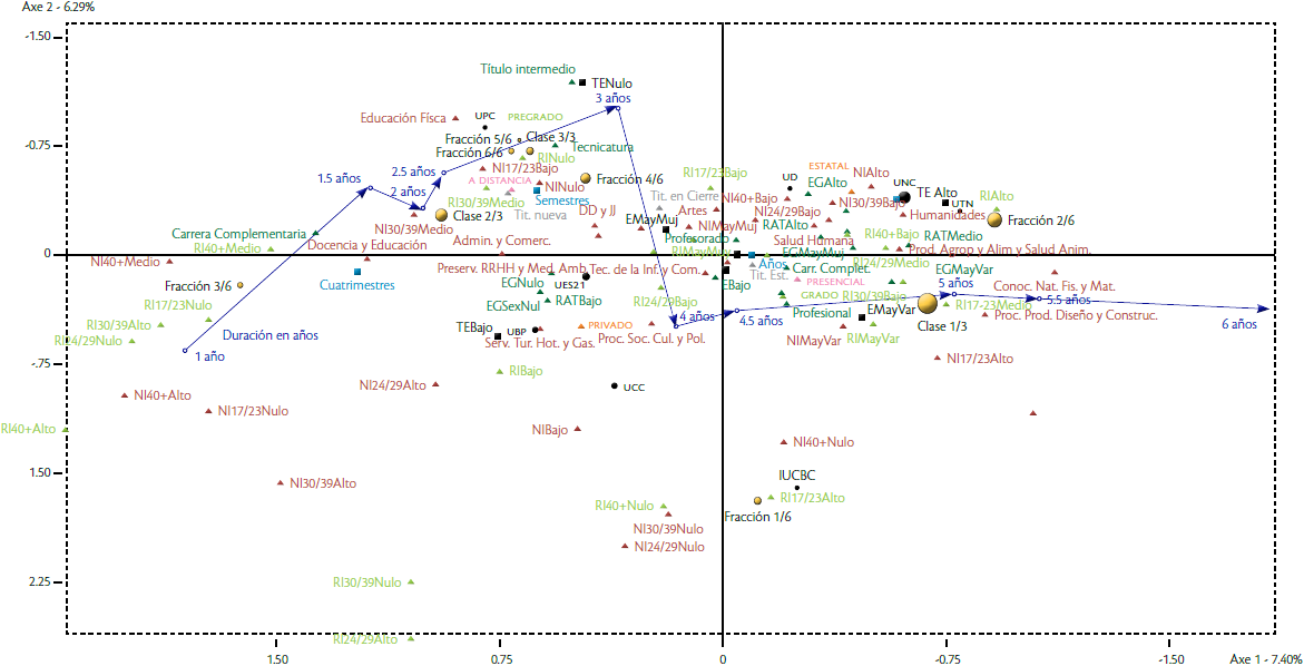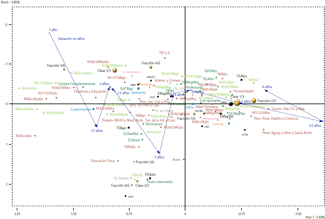 El primer factor está caracterizado principalmente por la duración de las titulaciones, yendo de 1 año en el tercer cuadrante a la izquierda, a 5.5 años en el cuarto cuadrante a la derecha, oponiendo las carreras de menor a las de mayor duración. El segundo factor es más complejo y opone con menor intensidad el régimen, el nivel, la modalidad de dictado y la proporción de estudiantes por sexo en las variables de matrícula.