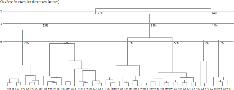 Para construir las clases de las titulaciones consideramos tres cortes en el dendrograma (Gráfico 1 en el Anexo) que, al ser la clasificación jerárquica y ascendente, permitieron definir la cantidad de grupos y subgrupos de titulaciones: primero un corte de dos clases, luego de tres y finalmente de seis (fracciones).6