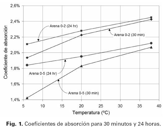 La magnitud de los coeficientes de absorción es mayor para la arena fina debido a su mayor superficie específica. En general, los resultados muestran que a mayor temperatura los coeficientes de absorción son también mayores. La diferencia entre los valores de los coeficientes de absorción a tiempos de saturación de 30 minutos y de 24 horas se reducen en función del incremento de la temperatura; de hecho estas diferencias casi son nulas en la máxima temperatura estudiada. Este hecho tiene consecuencias muy significativas en relación a la trabajabilidad en climas cálidos, ya que a temperaturas mayores los agregados absorberán más agua en menos tiempo, debido a una más rápida pérdida de trabajabilidad y a tiempos de fraguado menores. Desde un punto de vista práctico, estos resultados reflejan el ya bien conocido fenómeno de pérdida de trabajabilidad del concreto en períodos estivales, ya que el agua de mezclado es rápidamente absorbida por los agregados durante el proceso de mezclado.