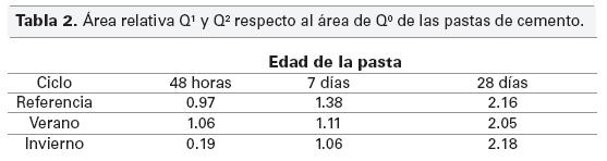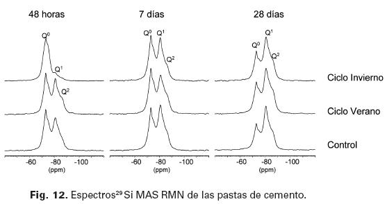 Puede observarse en la tabla anterior que a la edad de 48 horas, la cantidad de CSH formado en la pasta sometida a condiciones de invierno es significativamente menor que la que se obtiene en la pasta de referencia y la pasta sometida al ciclo de verano, siendo mayor en este último caso. Sin embargo, en la pasta sometida a condiciones de verano la cantidad de CSH formado se mantiene aproximadamente constante entre 48 horas y 7 días, indicando una inhibición de los procesos de hidratación. Esto no ocurre en la pasta de referencia y la sometida a condiciones de invierno donde la cantidad de CSH aumenta, especialmente en la pasta sometida a condiciones de invierno. A partir de 7 días, las tres pastas evolucionan de forma similar, aunque la pasta sometida a ciclo de invierno muestra una velocidad de formación de CSH mayor que las otras dos pastas estudiadas. Por otro lado, a la edad de 48 horas, el espectro de 29 Si RMN de la pasta sometida a condiciones de verano muestra una señal Q2 más evidente que la pasta de referencia indicando que la temperatura favorece la formación de cadenas formadas por más de dos iones silicato. Sin embargo, a esta edad, el CSH formado en la pasta de referencia está compuesto fundamentalmente por dímeros. Esto indica que la temperatura, además de influir en la cantidad de CSH formado a edades tempranas, también afecta a su morfología.