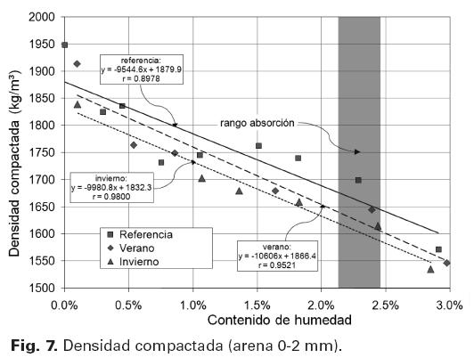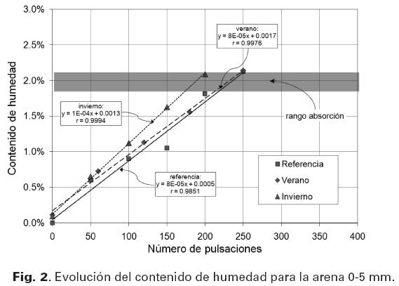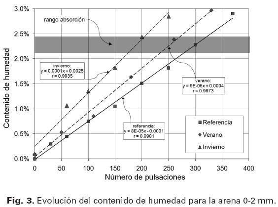 Puede verse que la tendencia de penetración de la sonda en función del contenido de humedad es creciente y lineal, debido al efecto lubricante de la humedad de la arena que hace que la aguja penetre con mayor facilidad. En cuanto a la influencia de la temperatura, puede verse también que las arenas ensayadas bajo condiciones de referencia permiten una penetración mayor, seguidas por las de verano y, por último, por las de invierno. Este comportamiento se debe a cambios en la textura superficial de los agregados, en los cuales se reduce el efecto de "engranaje", debido al contenido de humedad presente.