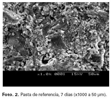 La Foto. 1 muestra la pasta de referencia a la edad de 48 horas, en la cual puede notarse una microestructura caracterizada por el desarrollo de CSH recubriendo las originales partículas de cemento.