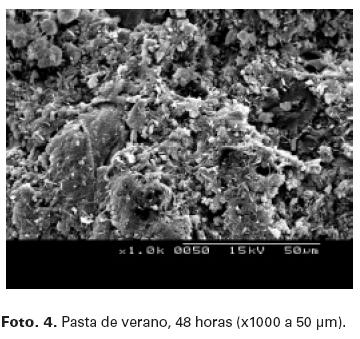La pasta de cemento sometida a condiciones extremas de verano muestra, a la edad de 48 horas, una gran integridad debido a la extensiva formación de CSH recubriendo las originales partículas anhidras de cemento como muestra la Foto. 4.