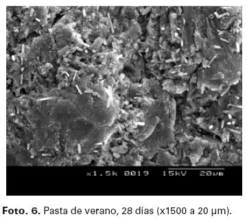 Destaca en la pasta sometida a condiciones de verano a la edad de 7 días, la formación de numerosos cristales en forma de placas entrecruzadas formando un ángulo entre sí de 60º, como lo muestra la Foto. 5.