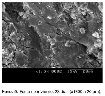 Como se puede observar en la Foto. 7, la pasta de cemento sometida a condiciones de invierno muestra a la edad de 48 horas, una microestructura caracterizada por una baja cohesión entre las partículas parcialmente anhidras del cemento debido a la escasa formación de CSH. Destaca la presencia de numerosos y diminutos cristales con morfología cúbica y también se observan pequeños cristales de etringita.