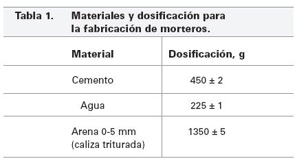 Con el objeto de determinar la influencia de la humedad y temperatura de la arena en la trabajabilidad del mortero, se fabricaron varios morteros con cemento Portland y arena caliza triturada de tamaño de partículas 0-5 mm. Las proporciones utilizadas son las correspondientes a las especificadas en la "European Standard (EN196-1): Methods for Testing Cement. Determination of strength", y se muestran en la Tabla 1.