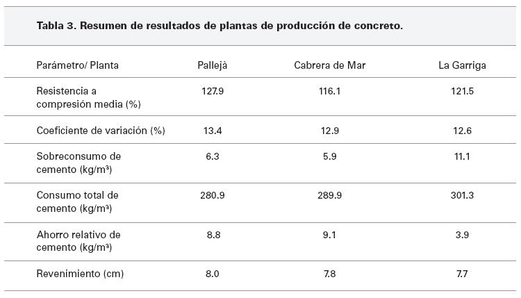 Es preciso mencionar que este estudio estuvo enfocado desde el principio a desarrollar aplicaciones industriales para optimizar las sobredosificaciones del concreto en climas cálidos [12]. En función de los resultados obtenidos y de la formulación metodológica propuesta en esta investigación, es posible optimizar estas dosificaciones de cemento cada día en función de ciertos parámetros ambientales, teniendo al final una reducción en los costos de producción y en la cantidad de cemento a emplear, lo cual tiene ventajas desde el punto de vista económico y ambiental. Una vez formuladas las bases metodológicas y verificada experimentalmente en laboratorio su viabilidad [20], se procedió a implementar dicho planteamiento a nivel industrial en tres plantas de producción de concreto premezclado, ubicadas en los municipios de Pallejà, Cabrera de Mar y La Garriga, dentro del territorio de Cataluña, España, durante el verano del año 2005 (en los meses de junio, julio y agosto). El resumen de los resultados obtenidos en las tres plantas de producción se muestra en la Tabla 3.