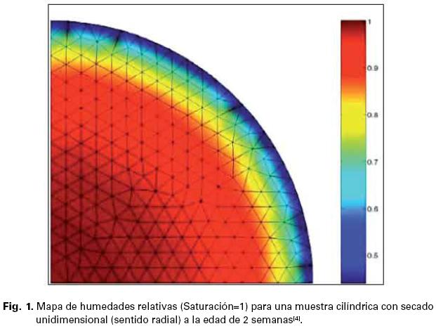 El coeficiente de difusión Dw no es constante, lo que dificulta la solución numérica de la Eq. (1). En la Fig. 1 se muestra la distribución de humedad relativa en sentido radial para una probeta cilíndrica de concreto, con secado unidimensional, calculado para un concreto con relación agua/cemento=0,55, y a la edad de 2 semanas, según Guillerón, et. al.[4]. En la misma, se observa claramente que el núcleo permanece con humedades relativas superiores al 90% y el secado se limita a las zonas expuestas.