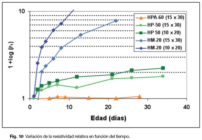 El valor que se representa en ordenadas corresponde a la resistividad relativa, cuyo valor es función de la pérdida de masa por secado. El empleo de escala logarítmica para el eje de ordenadas mejora la sensibilidad del gráfico. Es evidente distinguir cómo un concreto de alta resistencia y cuya porosidad es muy baja, prácticamente no se seca en el período considerado (28 días), mientras que el concreto de clase resistente más baja experimenta la máxima variación de su resistividad relativa. Los casos restantes, se ordenan según su clase resistente y el tamaño de muestra empleada. La descripción y análisis de esta nueva metodología de carácter completamente no destructivo excede el alcance de este trabajo, pero está desarrollada con detalle en Fernández Luco[13].