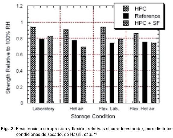 En estudios más recientes, como los informados por Hasni et. al.[6] sobre los resultados de resistencia a la compresión y flexión de muestras estándar de laboratorio sometidas a la acción de aire caliente (secado severo), y a un secado moderado en condiciones de laboratorio, relativas a las obtenidas en condiciones de curado estándar, se ilustran en la Fig. 2. Se observa que, en ningún caso, la pérdida relativa supera el 30%.