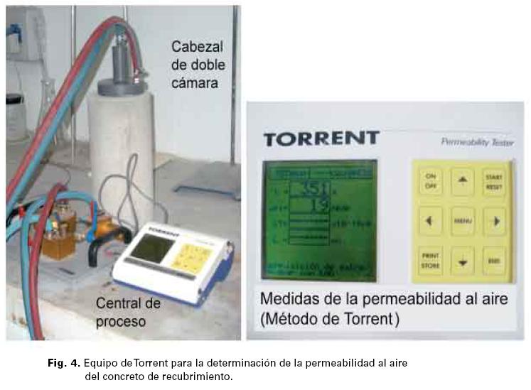 Para la determinación de la permeabilidad al aire se empleó un equipo comercial, apto para mediciones tanto en condiciones de laboratorio como in situ, de manera no destructiva. El equipo, que se ilustra en la Fig. 4, dispone de una celda de doble cámara cilíndrica, de aproximadamente 10 cm de diámetro, unida a una bomba de alto vacío, con sus correspondientes sensores y válvulas comandadas por un ordenador. La celda se adhiere a la superficie del concreto por el vacío que proporciona la bomba y los sensores miden la pérdida de ese vacío por efecto de la porosidad interna del concreto. La doble cámara evita las corrientes de aire espurias y permite el cálculo del coeficiente de permeabilidad K del concreto de recubrimiento, que se muestra en el visor de la unidad de proceso.
