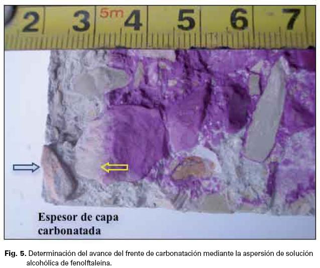 La detección del avance del frente de carbonatación provee una medida directa de la susceptibilidad del concreto de recubrimiento al ingreso de CO2 atmosférico. Este avance es sencillo de medir, empleando una solución alcohólica de fenolftaleína, ya que la zona carbonatada queda incolora, mientras que la zona no carbonatada se tiñe de color fucsia, como se ilustra en la Fig. 5.