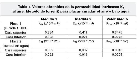 Por el contrario, la medida de la permeabilidad al aire, empleando el Método de Torrent, muestra que el efecto de un secado prematuro se traduce en el incremento de un orden de magnitud en el valor de la permeabilidad intrínseca KT. Esto se puede observar en la Tabla 1, que ilustra los valores medios obtenidos de dos determinaciones sobre las placas de concreto.
