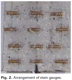 Based on European Standard EN 14651 tes Method for steel fibre concrete -Measuring the flexural tensile (limit of proportionality, LOP, Residual strenstrength ), the new test was developed to investigate the flexural toughness of shotcrete. The panel has the same dimensions as the EN14488-5 square panel test and measures 600 mm square by 100 mm thick. The panel is loaded in simple centre-point bending and the distance between the lower supports is 500 mm. It has a central notch and this notch is 2 mm wide (saw cut) and 10 mm deep, see Fig. 1. The panel test was conducted in a 1000 kN hydraulic servo-controlled testing machine, and the panels were subjected to a laterally-distributed line load under deformation control with a deformation rate of 0.2 mm/min. Four LVDTs were used to analyze the displacement at the mid-span and supports at both ends, and the difference between the deformations at mid-span and at the supports was calculated to be the net mid-span displacement. Three crack gauges, located at the middle and each side of the panel, were placed in the middle of the notch for evaluation of the Crack Mouth Opening Displacement (CMOD). Fig. 2 shows the arrangement of strain gauges on the side of the specimen and Fig. 3 shows the LVDT's used to determine the deflections required for a plot of applied load versus mid point deflection.