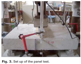 The geometry of the panel is 600 mm square by 100 mm thick, the distance between the lower supports was 500 mm, the notch was 2 mm thick (saw cut) and 10 mm deep and all the instrumentation system to measure the CMOD will be useful to better understand this phenomena specifically for sprayed concrete using polymer fibres.