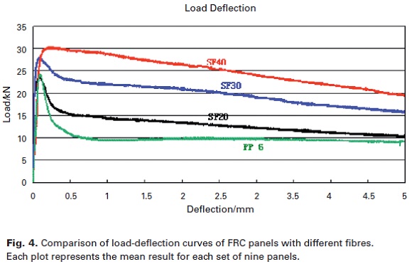 The panel test is also appropriate for a comparison of different fibre types and dosages. It allows a comparison between mesh reinforcement and fibre reinforcement, provided that the failure mode is in accordance with EN 14487-1. Indeed the performance criteria based on this test were established to compare steel mesh and steel fibres (materials with the same modulus of elasticity, E). That is why these criteria do not appear to be appropriate with macro-synthetic fibre reinforced shotcrete due to their mode of failure. Some recommendation as in Filand imposed an additional criteria: Fmax/Fl >1,2 with: