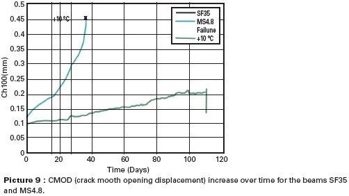 Futher more this report the importance of temperature. "Indeed during the second test, the temperature was incidentally increase by 10°C for a period of 11 days. During this period the beam reinforced with polymer (MS4.8) fibre showed a significant in-crease in the slope of the CMOD curve while the beam with Steel Fibre (SF35) was less sensitive to the temperature change".