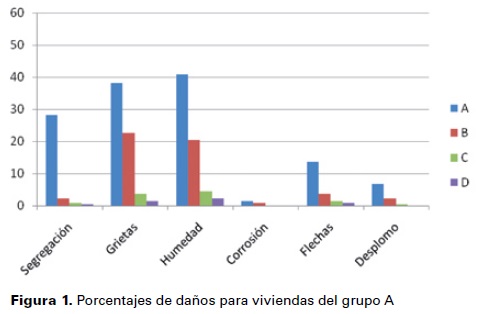 Al analizar las afectaciones más usuales en las losas de las viviendas, resulta muy significativo el porcentaje de daños principalmente en lo relacionado con segregación, agrietamientos y humedades. En el grupo B (autoconstrucción) se presentan significativamente más daños que en el grupo A excepto en las deformaciones (flechas) cuya tendencia es aproximadamente la misma. Solamente en el nivel B en el apartado de grietas se observa un porcentaje mayor en el grupo A de viviendas de construcción formal respecto al B de autoconstrucción, en todos los demás casos se tienen más daños en el grupo B. Como podía esperarse, los daños en la mayoría de los casos (60 a 90 % en grupo A; 37 a 67 % en grupo B) son leves que no afectan significativamente la resistencia, pero sí la durabilidad en caso de que no sean tratados adecuadamente. Definitivamente no se están utilizando en la vivienda, concretos de características adecuadas para lograr una durabilidad suficiente. Aunado a esto, la supervisión de los procesos constructivos y la calidad de mano de obra se descuidan, lo cual preocupa principalmente en las viviendas del grupo A, ya que se supone que el diseño y el proceso constructivo deberían estar a cargo de profesionistas calificados. Aunque las pruebas fueron pocas en número, permiten identificar variaciones importantes del concreto lo que se reflejó, por ejemplo, en las pruebas de dureza, lo cual supone procedimientos poco controlados en la mezcla, transporte (del lugar donde se hace la mezcla a la parte correspondiente de la obra), colocación y curado del concreto en las losas (ACI, 2005).