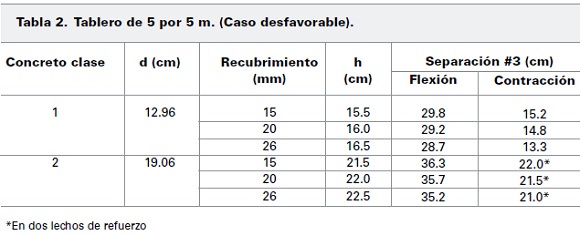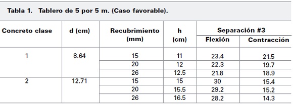 Considerando estas condiciones se puede calcular el peralte requerido para los casos "favorable" y "desfavorable", tomando en cuenta la clase de concreto y el recubrimiento requerido. El resumen de resultados se presenta en las Tablas 1 y 2. En estas tablas h es el peralte total de la losa; d, es el peralte efectivo y "Separación #3" significa la separación de barras con diámetro de 3/8" (10 mm).