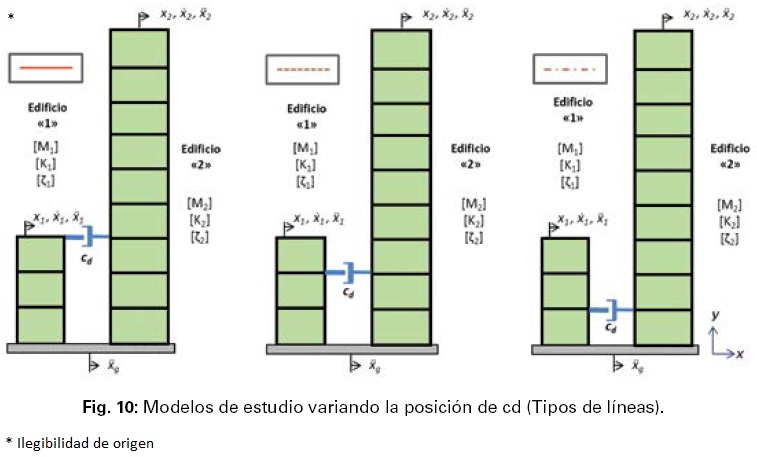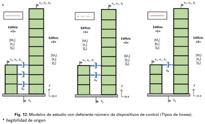 Una vez que se determinó que la mejor posición de conexión es el punto más alto del menor de las estructuras, se procedió a investigar el número necesario de puntos de conexión para lograr una reducción óptima de desplazamientos. Los modelos considerados se muestran en la Fig. 12. La línea discontinua representa el uso de tres dispositivos, la intercalada el uso de dos y la continua el uso de un solo amortiguador.