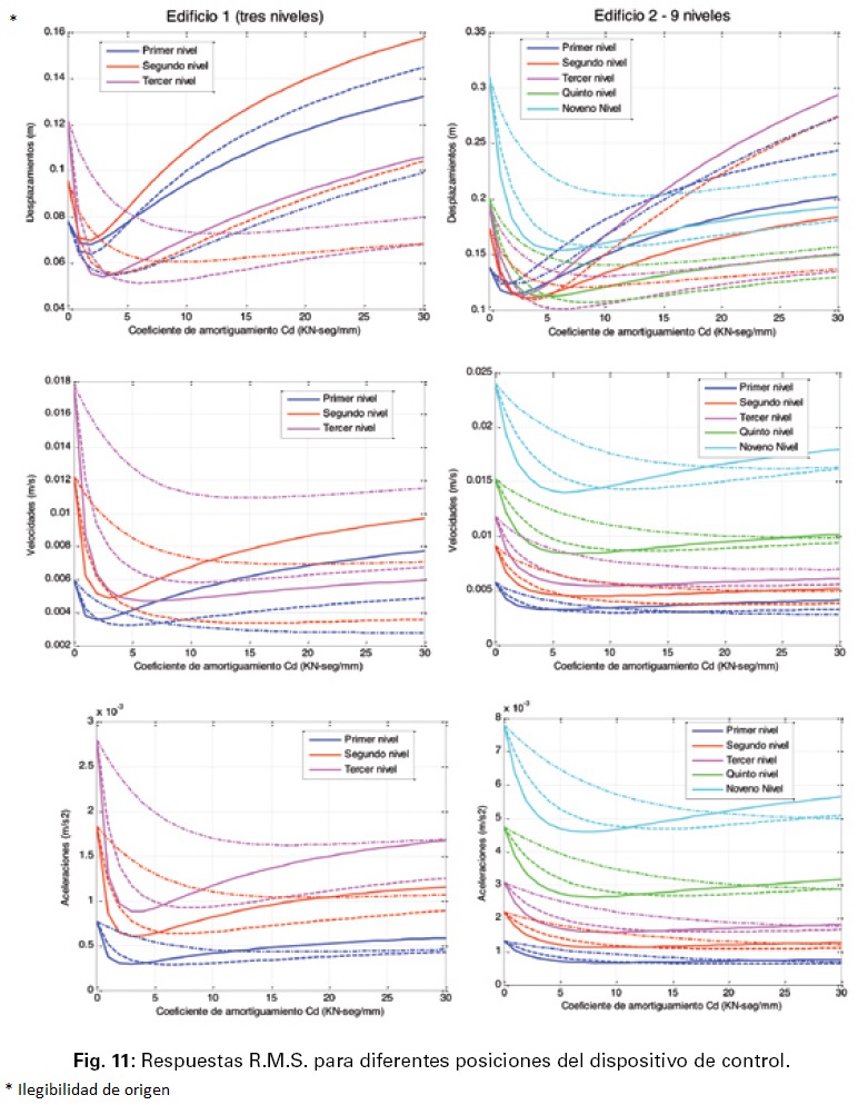 Se calcularon las respuestas R.M.S. en desplazamientos, velocidades y aceleraciones para diferentes valores de cd. En base a estos resultados se determinó la mejor alternativa de conexión (Fig. 11).
