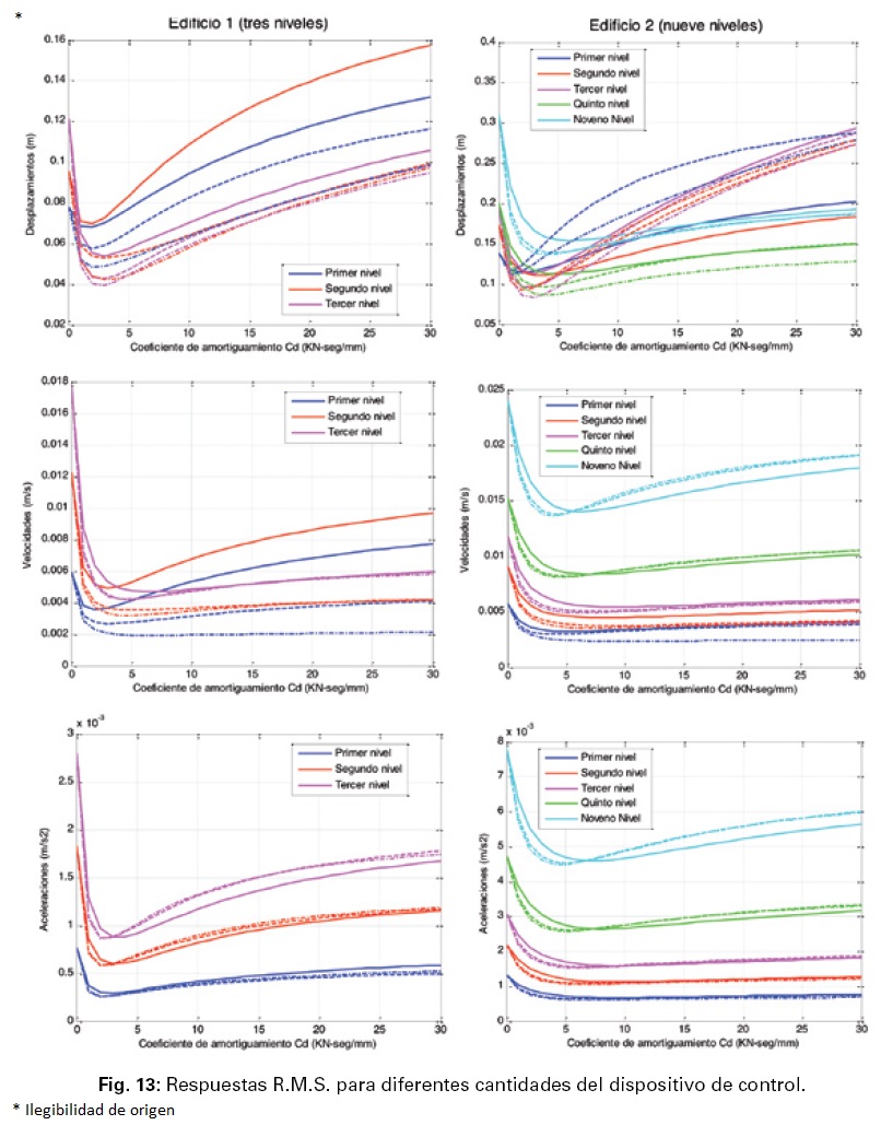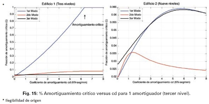 De la Fig. 13 se puede apreciar que la mejor alternativa es utilizar tres amortiguadores, uno en cada nivel de acoplamiento. Se observa que la capacidad de control cuando existen tres amortiguadores es mayor que cuando existe sólo uno; además, el valor de cd (óptimo) para alcanzar las respuestas mínimas es menor cuando se utilizan tres dispositivos.
