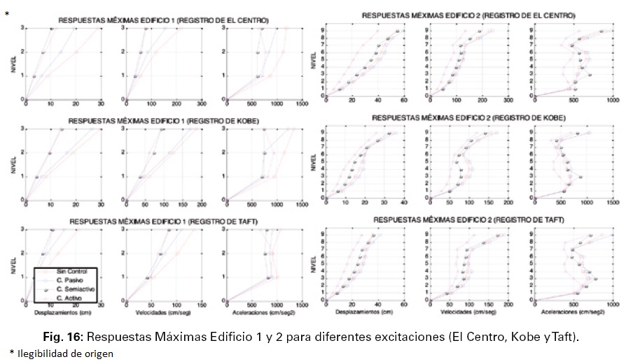 En la Fig. 16 se observa que los tres sistemas de control reducen las respuestas en el edificio 1. Mientras que en el edificio 2, sólo el sistema activo tiene una buena capacidad de control, el semiactivo reduce las respuestas en poca proporción y el sistema pasivo perjudica las respuestas.