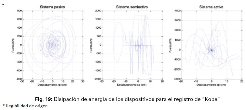 Otra manera de expresar la reducción de las respuestas es la disipación de energía de cada uno de los sistemas, y se representa al graficar el desplazamiento que sufre el pistón versus la fuerza que ejerce (ver figuras 18, 19 y 20).