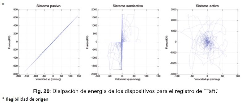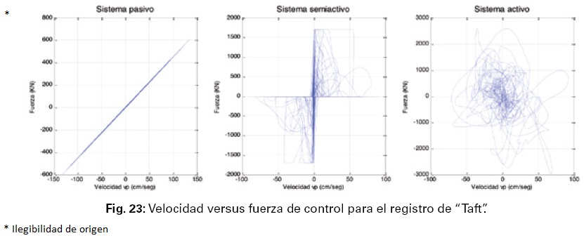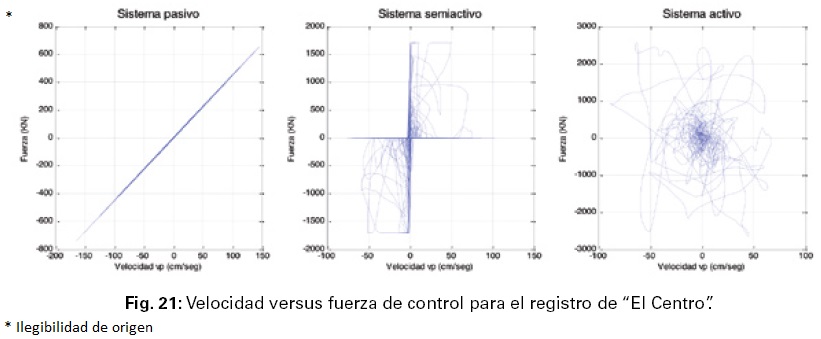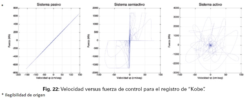 Las figuras 21, 22 y 23 representan el comando de fuerza de los dispositivos de control. Por ejemplo, el cuadrante de acción de un sistema pasivo, oscilara respecto al valor del coeficiente de amortiguamiento cd, ya que el único valor variable es la velocidad. En un sistema activo el comando de fuerza tiene su campo de acción en los cuatro cuadrantes; es decir, el dispositivo de control puede "empujar" y "jalar", para contrarrestar las excitaciones externas. En un sistema semiactivo, el campo de acción se limita a dos cuadrantes; es decir, solamente actúa en la misma dirección de la velocidad del edificio.