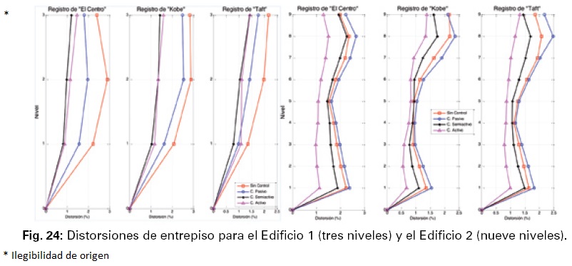 Las distorsiones de entrepiso para ambos edificios (tres y nueve niveles) se determinaron para los diferentes sistemas de control, y cuando los edificios están desacoplados. Se aprecia que para las diferentes aceleraciones de terreno consideradas, el comportamiento es parecido. El sistema activo y semiactivo reducen las distorsiones en el edificio 1 casi en la misma proporción (Fig. 24), mientras que la reducción del sistema pasivo no es muy consistente. Para el edificio 2, el sistema activo tiene un mejor comportamiento que el semiactivo, mientras que el pasivo perjudica la reducción de distorsiones (Fig. 24).